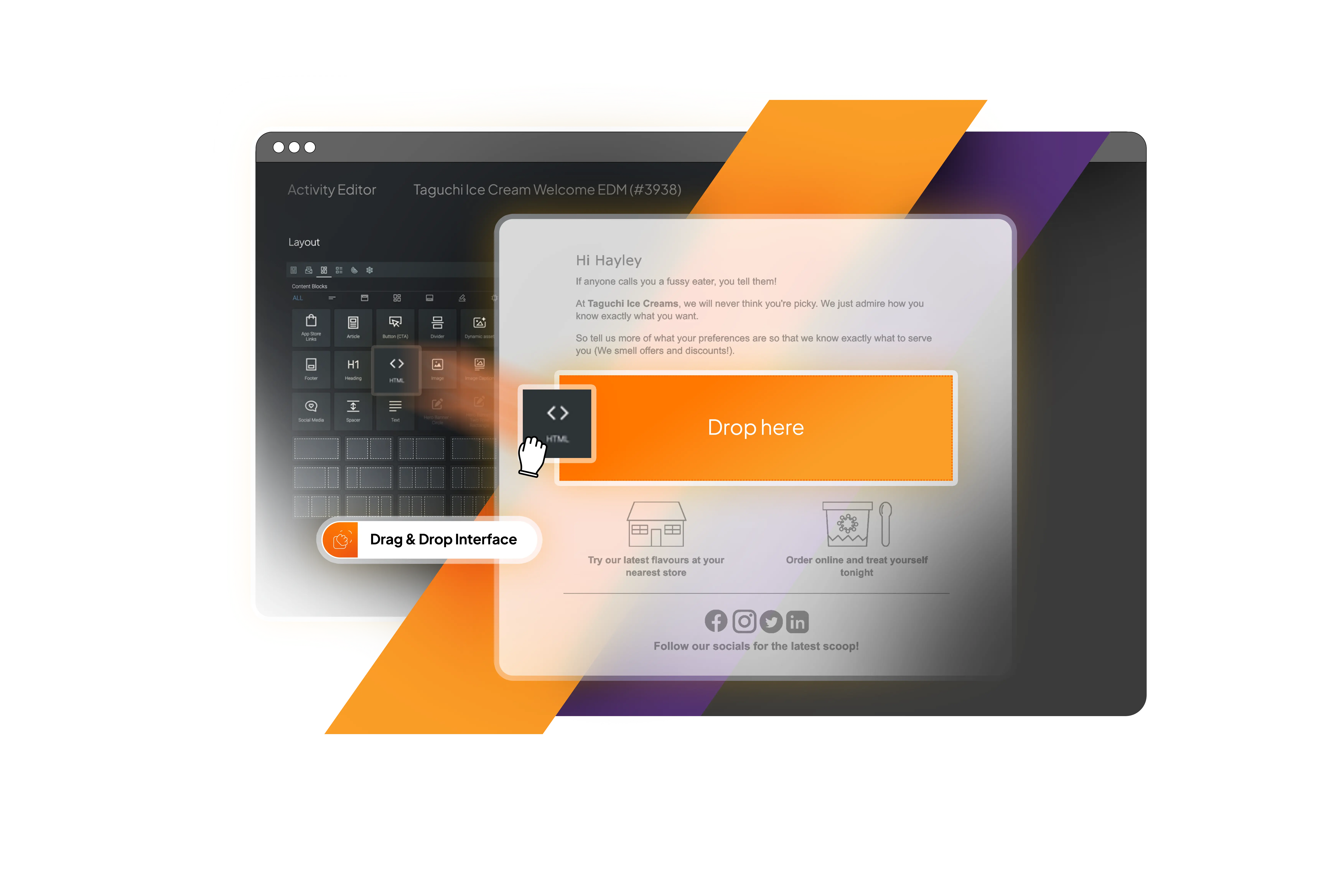 Think you need a designer or developer to create sleek, on-brand campaigns? With Taguchi, you don’t. Our intuitive drag-and-drop editor is built for every skill level—whether you’re an expert or just getting started, you can piece together campaigns using content blocks, images, text, and even video elements.